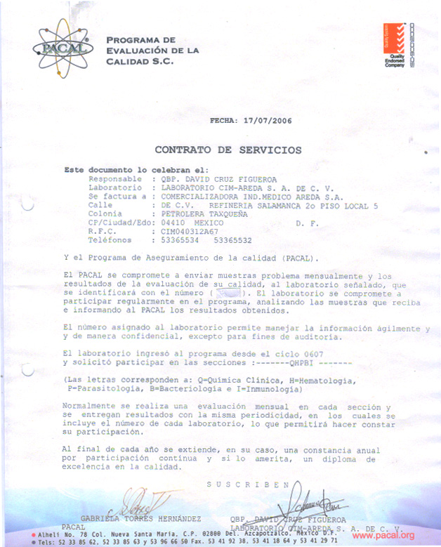 El laboratorio lleva a cabo el control de calidad interno diariamente y esta inscrito en el programa de evaluacion externa de la calidad (PACAL) intitucion que mensualmente nos envia sueros liofilizados para quimica clinica y hormonas asi como muestras de copro, orina y bacteriologia tambien un caso histopatologico y un caso de papanicolau via internet. para evaluar la calidad de nuestro trabajo. www.pacal.org